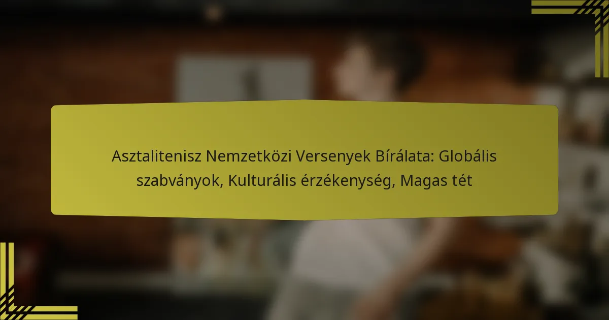 A nemzetközi asztalitenisz bíráskodását a Nemzetközi Asztalitenisz Szövetség (ITTF) által megállapított globális szabványok irányítják, amelyek a versenyek során a tisztességet és az integritást népszerűsítik. A bírók szerepe tovább bonyolódik a kulturális érzékenység szükségessége miatt, mivel döntéseiknek tiszteletben kell tartaniuk a játékosok különböző hátterét és viselkedését. A magas tétek miatt a bírók ítéletei jelentősen befolyásolhatják a mérkőzések kimenetelét és a sportolók karrierjét, ami hangsúlyozza a képzésük és teljesítményük értékelésének fontosságát.